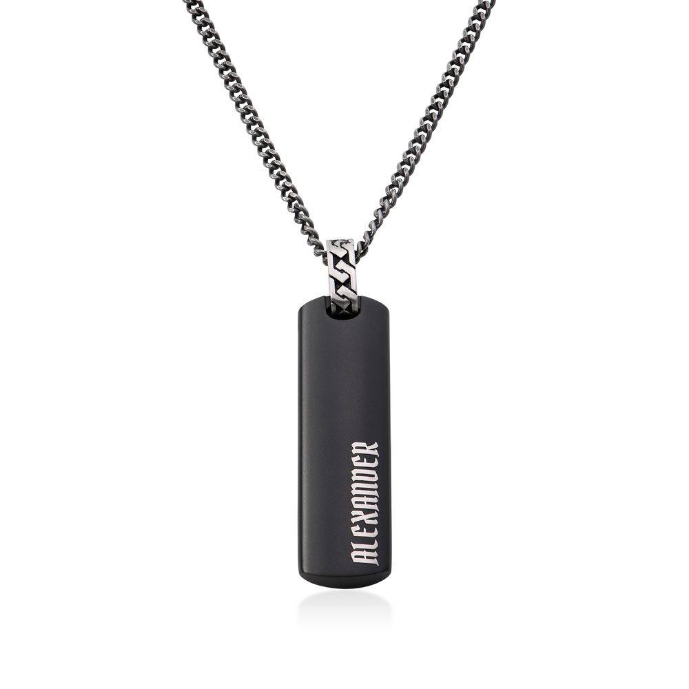 Bold and masculine, our 3D Engraved Bar Necklace for Men makes the perfect gift for Father's Day or any other occasion! This necklace showcases a single inscription of your choice on a black stainless steel vertical bar pendant. Our artisans use a special all caps font, displaying each letter in contrasting silver stainless. An ornate bail and a comfortable chain complement the pendant's slightly rounded edges. This necklace is made with stainless steel, and features:
